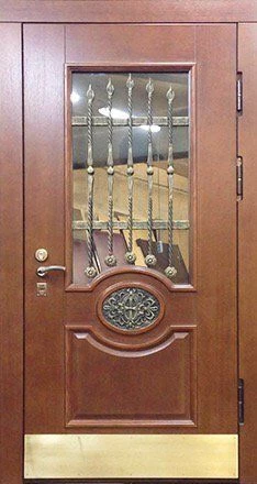 Часто декорирование дверей ковкой используют вместе со стеклом, отделывают витражным узором, используют зеркальные вставки. Стекло в этом случае применяется антивандальное, с трудом поддающееся разрушению.